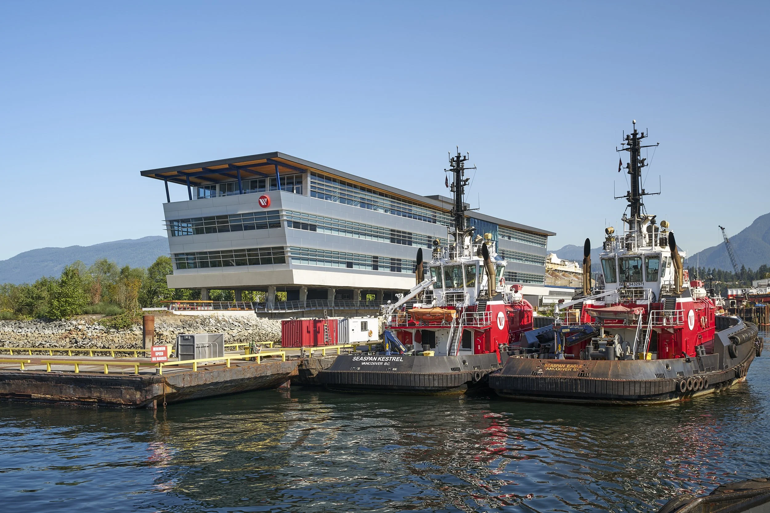 The design of Seaspan’s Head Office is a response to its organizational challenges, specifically having departments siloed in closed offices and different buildings. Here the company is united under one roof. Located on a dramatic waterfront site, the head office has a large cantilever over Burrard Inlet. Its subtle butterfly shape opens both to the south, with a view of the company’s tug boats in the harbour, and to the south, with views back to its shipyards. The open plan office provides daylight and views, while the closed offices are used to shield the remainder of users from the harsh western sun. The overall result is an extraordinarily functional and beautiful building, which connects people to both North Vancouver and the entire marine scape of Vancouver, setting the stage for one of the most important industrial campuses in Canada.